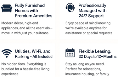 Enjoy comfortable living with our well-equipped, stylishly furnished rental homes that feel like home.