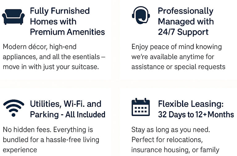 At Habi Rentals, we specialize in fully furnished mid-term rentals for professionals, families, and insurance-displaced tenants. Whether you’re relocating for work, waiting on home repairs, or in between addresses, we make temporary housing feel permanent in all the right ways.